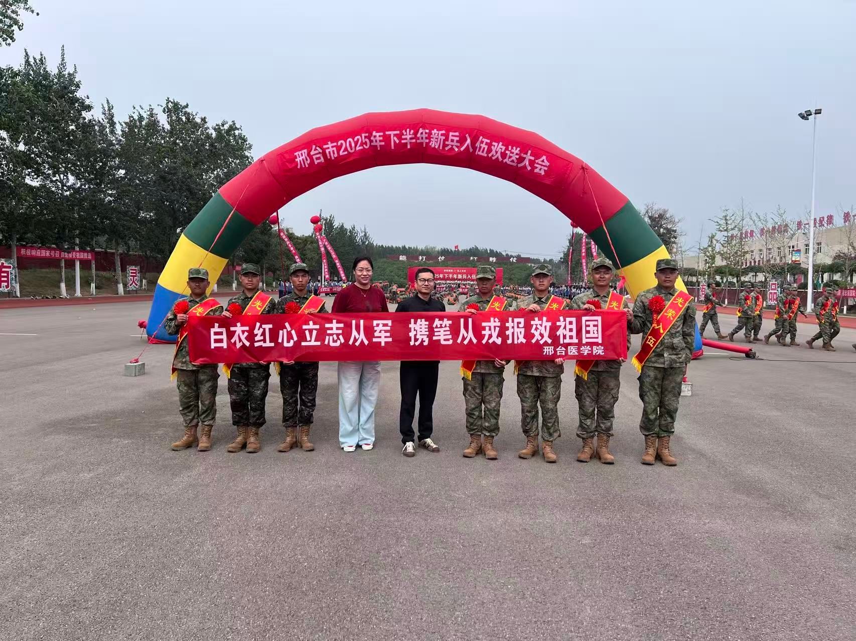 秋高气爽迎征客,军歌嘹亮壮行色。9月16日上午,学生工作处李艳老师、张子翔老师前往邢台市民兵训练基地,为我校2025年秋季光荣应征入伍的8名学生举行欢送仪式,向即将投身国防事业的青年学子送上全校师生的深切关怀与殷切嘱托。